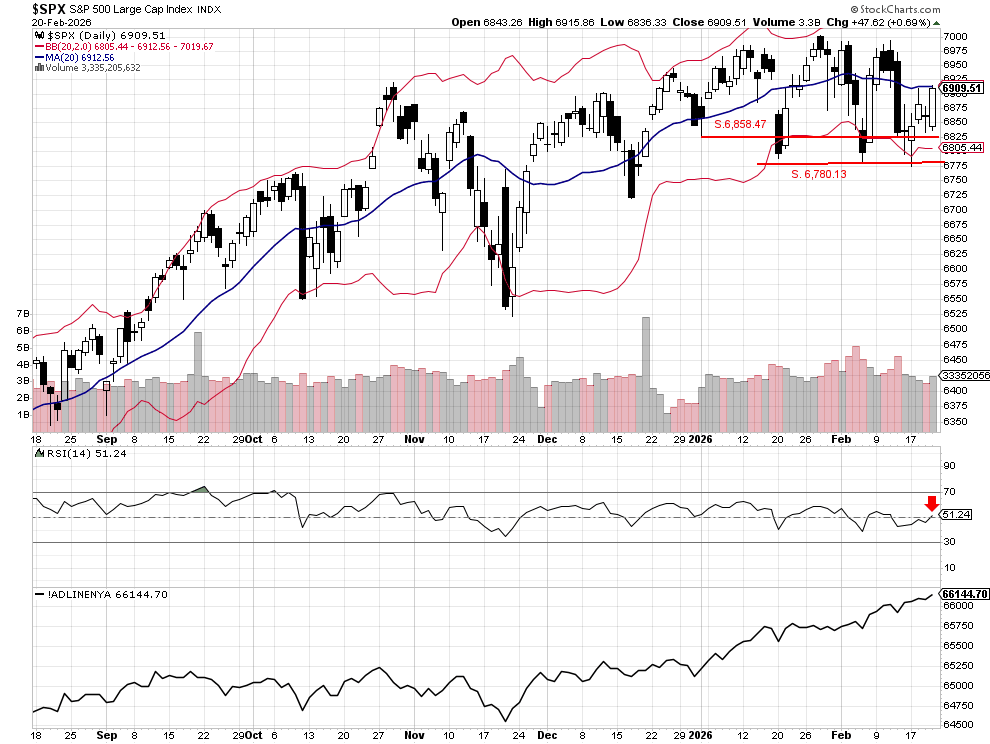 The S&P 500 rallied sharply to finish the week, closing at 6,909.51. However, the index was unable to push through the 20-day moving average at 6,912.56, which continues to act as a formidable resistance level.