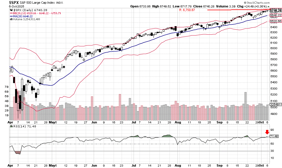 The S&P 500 closed at a new all-time high of 6,740.28, with the RSI finally breaking above 70 to confirm the move. However, buying enthusiasm appeared muted, as up volume accounted for only 46% of total volume. Since September 25, the index has advanced 2.6% without a meaningful pullback and now sits at the upper Bollinger Band.