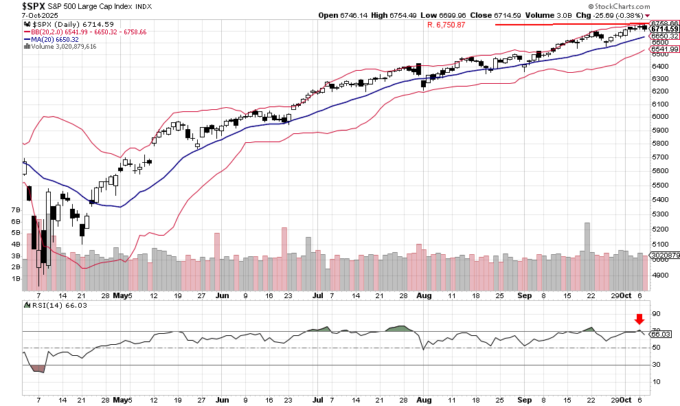 The S&P 500 experienced a broad-based sell-off after briefly testing the all-time high at 6,750.87. The index closed lower at 6,714.59, while the RSI slipped back below the overbought threshold, finishing at 66.03. Despite the pullback, the index appears to be forming a base and consolidating recent gains, which could be constructive for the next leg higher.
