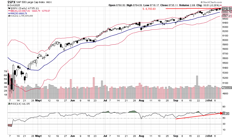 The S&P 500 tested resistance at 6,755.63, but sellers stepped in, pushing the index to close lower at 6,735.11. The RSI remains in an uptrend, though any additional selling today could tilt it into a short-term downtrend.