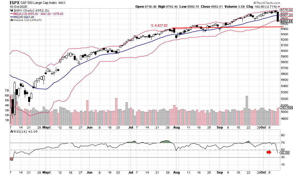 The S&P 500 suffered a sharp sell-off on Friday, declining 2.71% to close at 6,552.51. The index broke below its 20-day moving average and finished beneath the lower Bollinger Band, signaling a decisive shift in momentum. The RSI also fell sharply, closing at 42.09, confirming strong downside pressure.