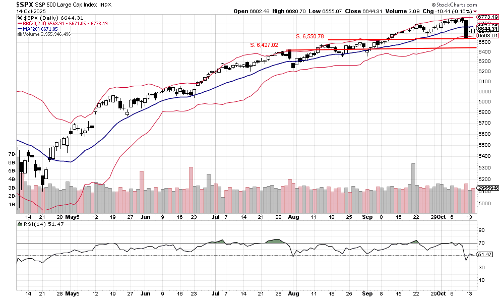 The S&P 500 traded down to and held support at 6,550.78. Buyers stepped in at that level, lifting the index to a higher close at 6,644.31. The index tested but failed to break through the 20-day moving average, suggesting that a new trading range may be forming. Buying pressure was not broad-based, with up volume accounting for only 68% of total volume. The ongoing third-quarter earnings season should provide additional insight into how tariffs are affecting corporate performance and the broader economy.