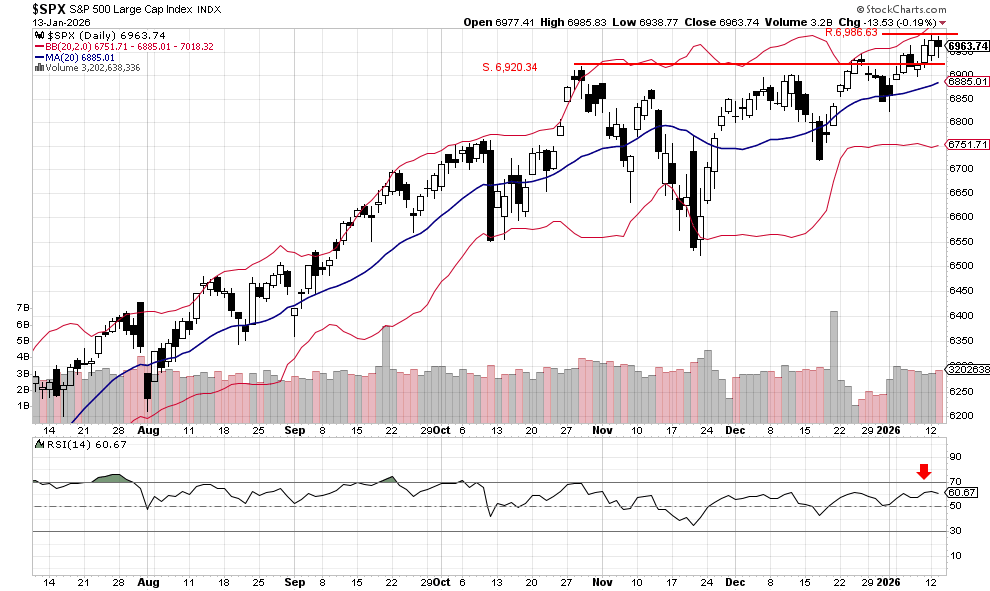 The S&P 500 closed lower at 6,963.74 after testing its all-time high, while the RSI also moved lower, finishing at 60.67. The index has now established a trading range between 6,920.34 and 6,986.63. We believe the lower end of this range could be tested today, as the uptrend appears to be losing short-term momentum.