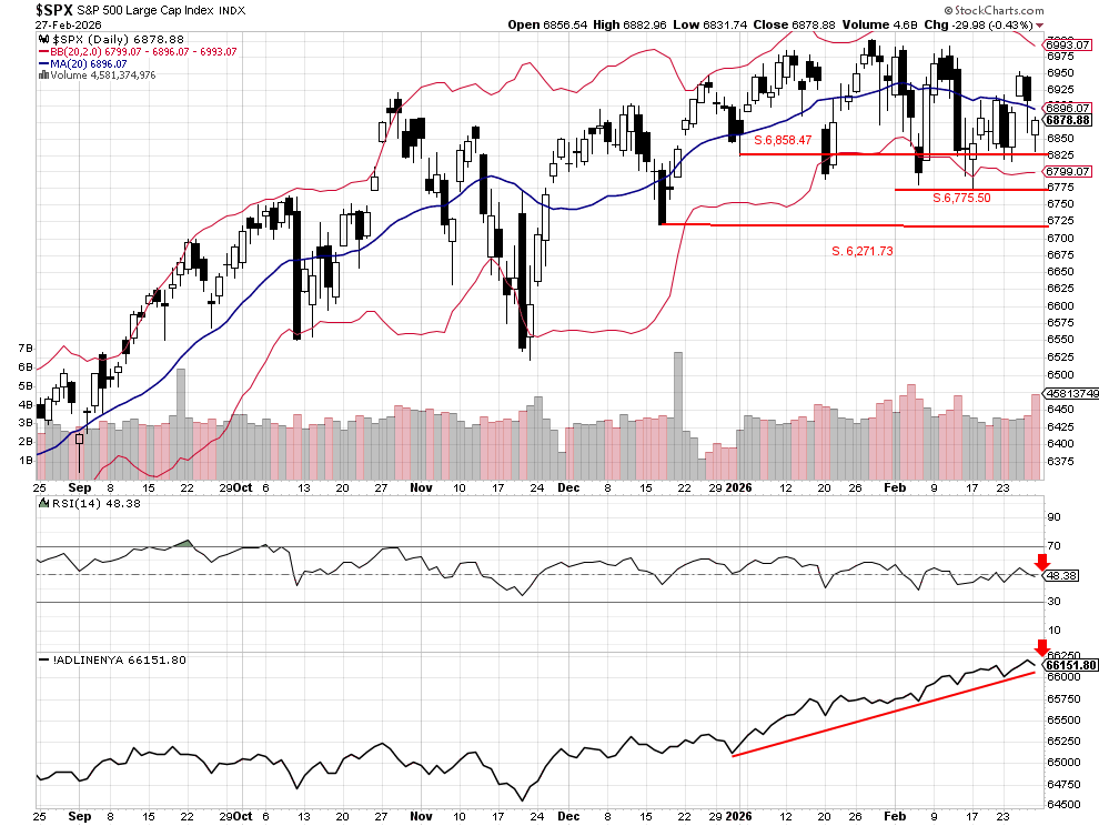 Momentum indicators are deteriorating. The RSI turned lower on Friday and remains below the 50 level, signaling weakening upside momentum. Additionally, the Advance-Decline line rolled over, reflecting narrowing breadth and confirming internal market weakness.