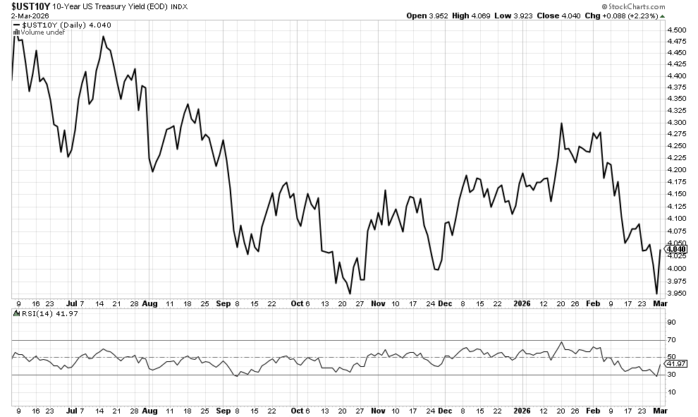 The U.S. 10-year Treasury yield has fallen to 4.04% amid intensifying geopolitical tensions over the Iran conflict. The drop in yields reflects a classic flight-to-safety trade, with capital rotating into Treasuries amid rising uncertainty.