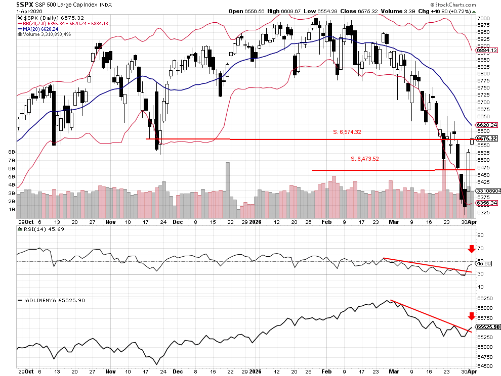 The S&P 500 rallied for a second consecutive session, closing higher at 6,575.32. The index pushed up toward the 20-day moving average at 6,620.24, where sellers emerged late in the day, reinforcing that level as near-term resistance.