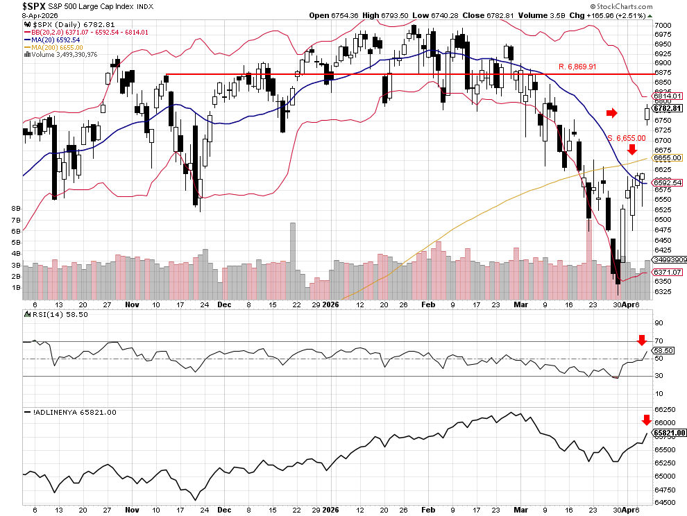 The S&P 500 gapped higher at the open and rallied throughout the day, closing at 6,782.81. The index decisively moved above both the 20-day and the 200-day moving averages. That move above the 200-day is significant and could attract additional buyers in the coming weeks.