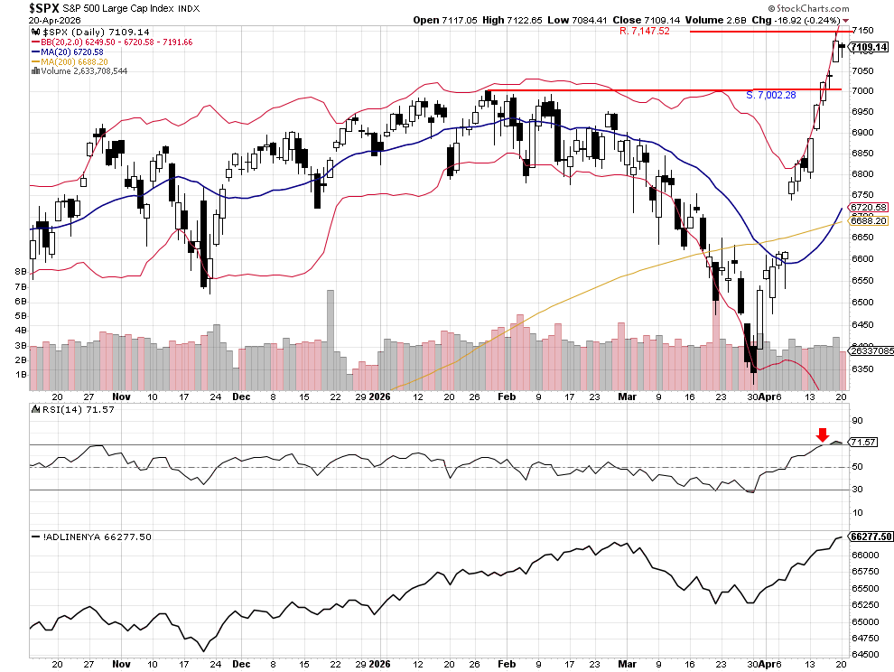 The S&P 500 closed lower at 7,109.14, while the RSI moved further into overbought territory, ending the day at 71.57. The index traded within the prior session’s range, forming an inside day. This type of price action is common in overbought markets and often suggests that recent buying momentum is beginning to slow. As a result, today’s trading could be relatively muted.