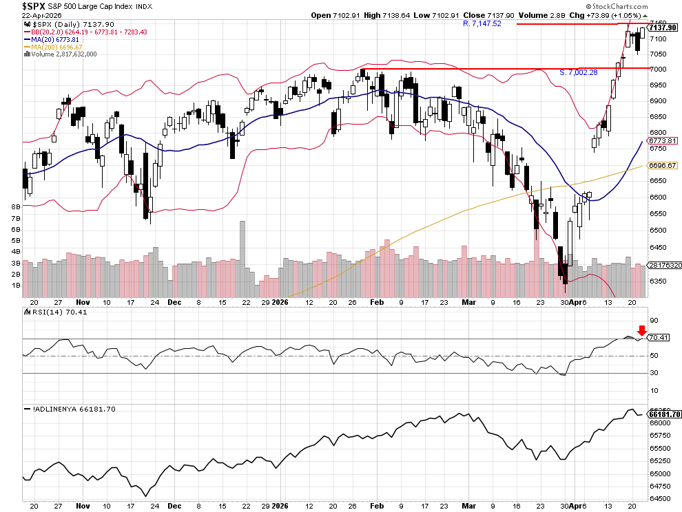 The S&P 500 closed at another all-time high of 7,137.90, but underlying participation metrics weakened. Up volume registered just 54% of total volume, failing to confirm the price advance and signaling a lack of institutional conviction. The RSI pushed back into overbought territory, increasing the probability of near-term mean reversion, while the Advance-Decline line closed flat, indicating narrowing breadth beneath the surface.